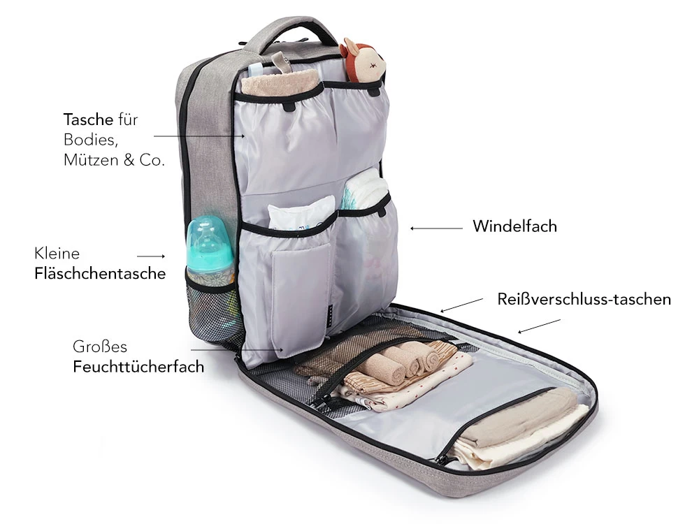 - PRAKTISCHES DESIGN – Der vordere Teil des Rucksacks lässt sich komplett aufklappen und offenbart somit alle Wickelutensilien.