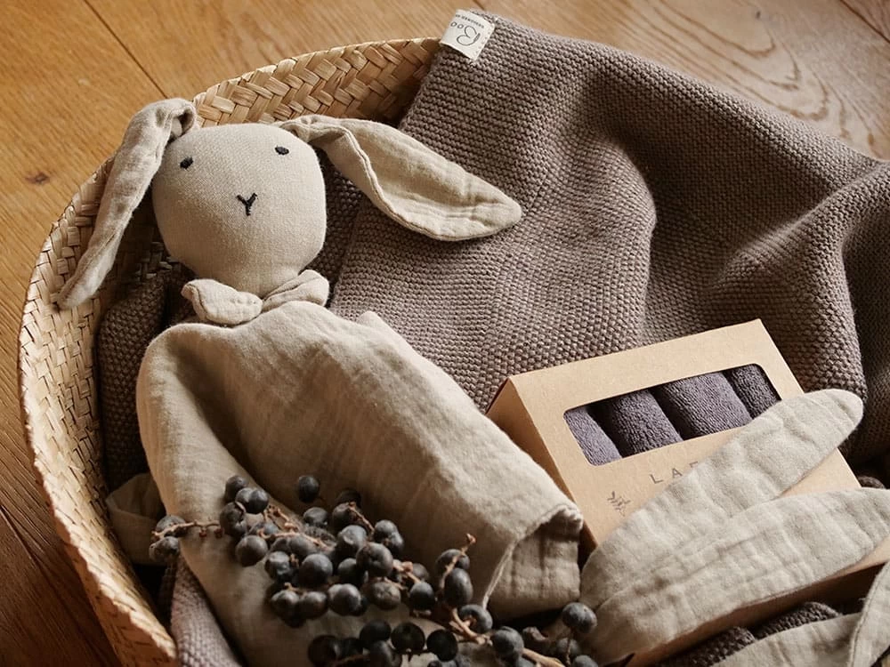 Dieses wunderschöne Baby-Geschenkset besteht aus 1 x Babystrickdecke Neo Balsa + 1 x Musselin-Stoffhasen Fawn + 1 x Pack Babywaschlappen Elephant – alles in edlen Erdtönen gehalten.