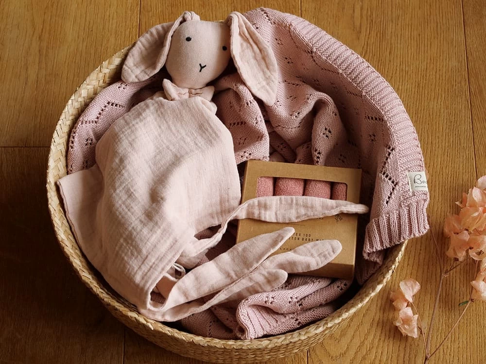 Bitte Beachte: Dieses Set wird aktuell mit „Schnuffelhase Fawn“ (nicht wie auf dem Foto) geliefert ! Mit diesem traumhaftem Geschenkset für Babys in rosa kannst du Eltern eines kleinen Mädchens eine riesen Freude bereiten. Bestehend aus 1x Pointelle-Babystrickdecke Primrose + 1 x Musselin-Stoffhase Misty Rose + 1 x Pack Babywaschlappen Berry.