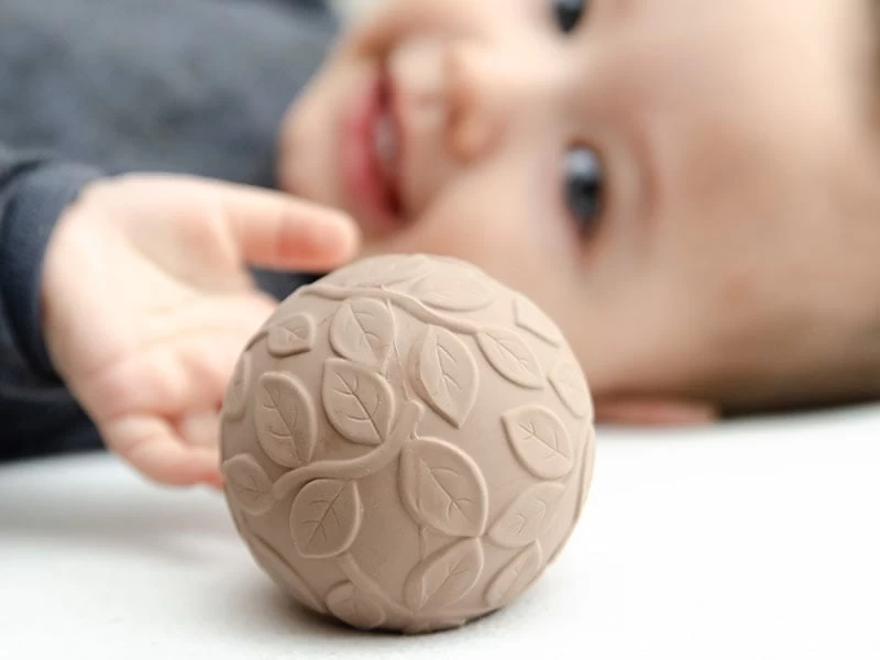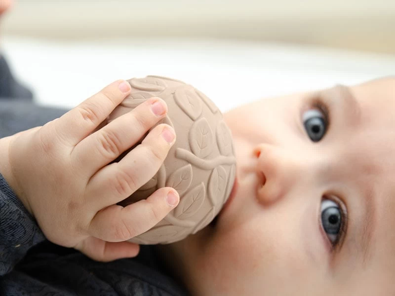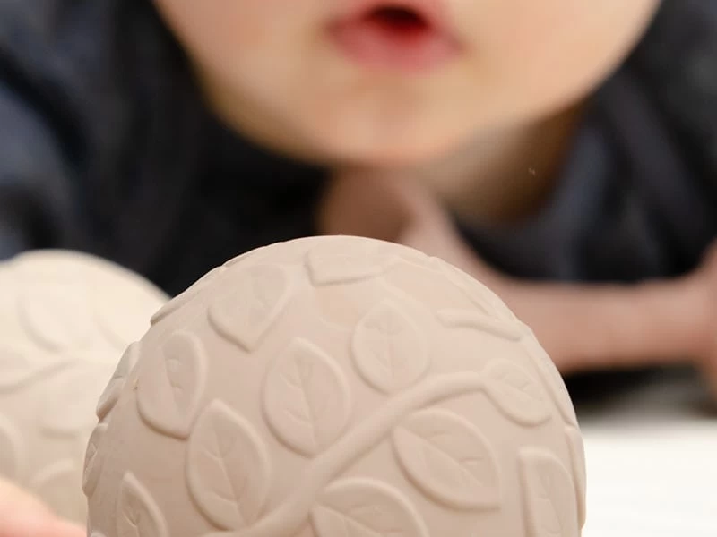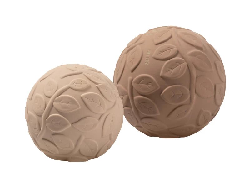 Toll gearbeitetes Set aus zwei Baby-Greifbällen in den Farben Mauve und Beige. Die Bälle sind aus naturbelassenem Kautschuk und haben kleine Blättchen als strukturierte Oberfläche, interessant für Baby’s Tastsinn. Beim Schütteln klingelt ein angenehmer Glöckchenton im Inneren. Die Bälle sind lebensmittelecht und unbedenklich für dein Kind. Die Kautschukprodukte von Natruba haben keine Löcher, somit kann kein Schimmel im Inneren auftreten.