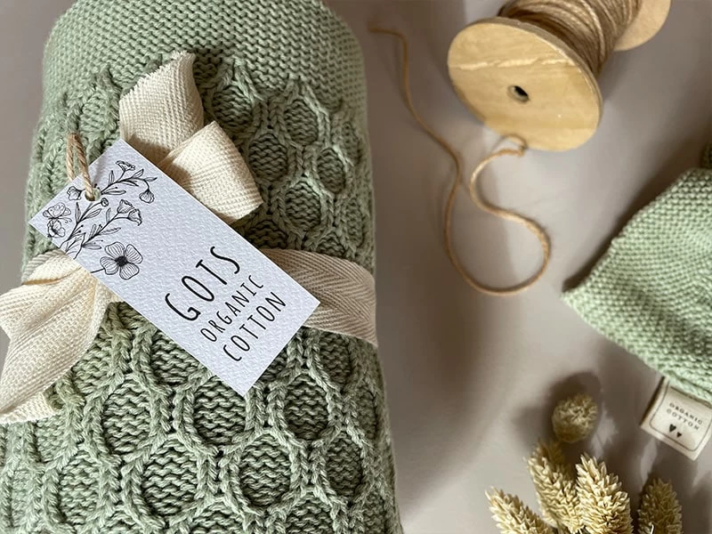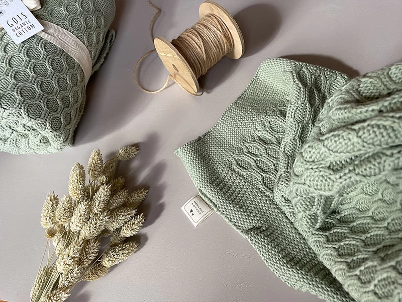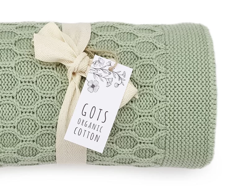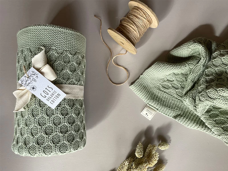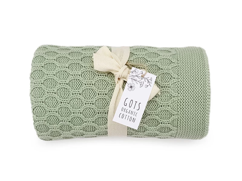 Weiche gestrickte GOTS-Kuscheldecke, perfekt für unterwegs und zuhause. Die Decke hat ein wellenförmiges Strickmuster (Vorderseite). Farbe: traumhaftes Salbeigrün.