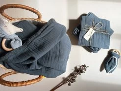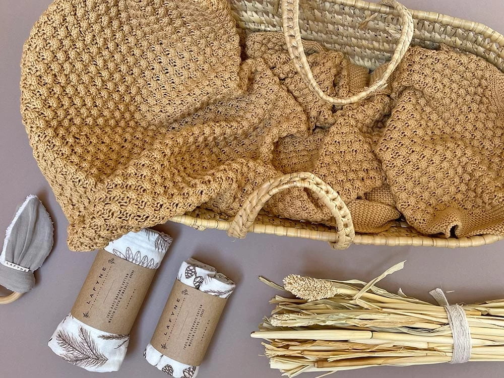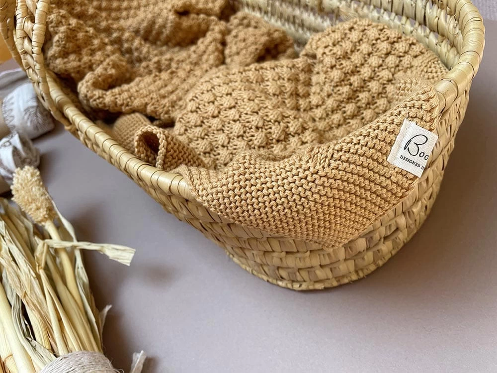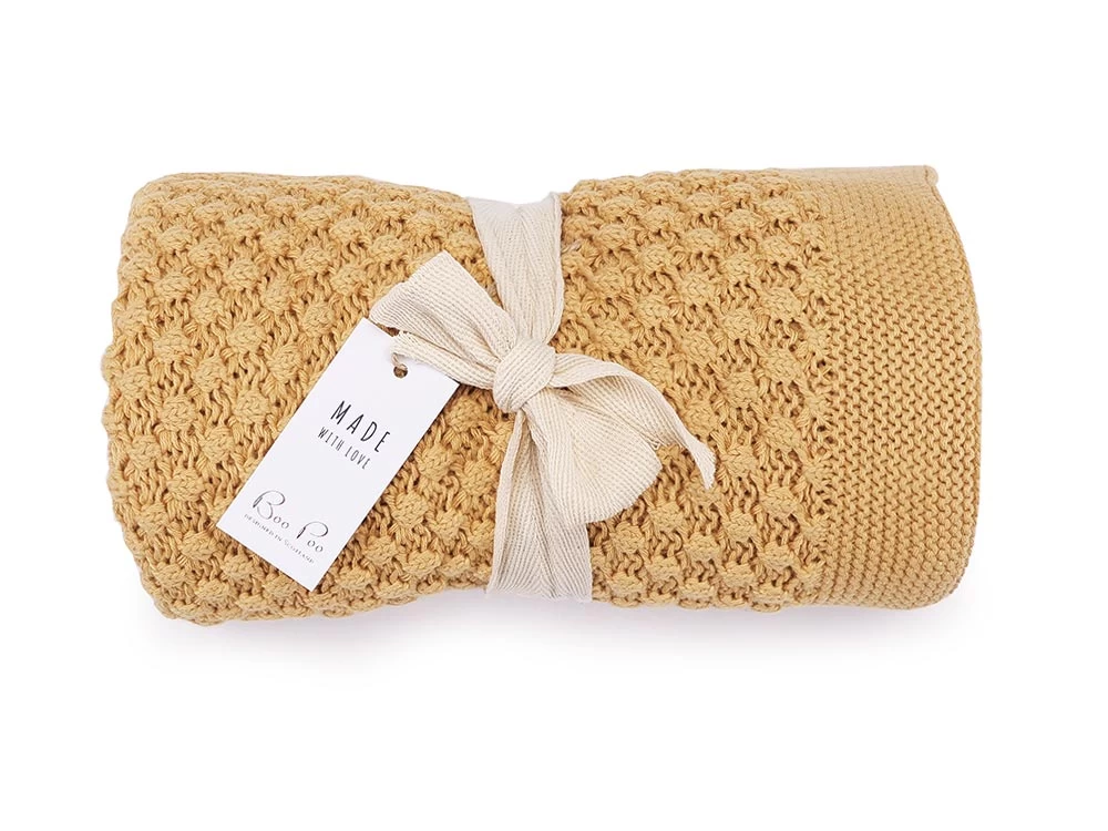 Weiche Babystrickdecke aus GOTS Biobaumwolle in einem tollen Strickmuster im Popcorndesign auf der Vorderseite. Farbe: wunderschöner zarter Honigton.