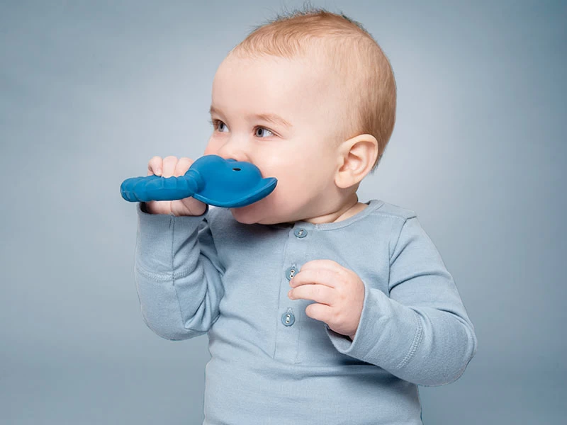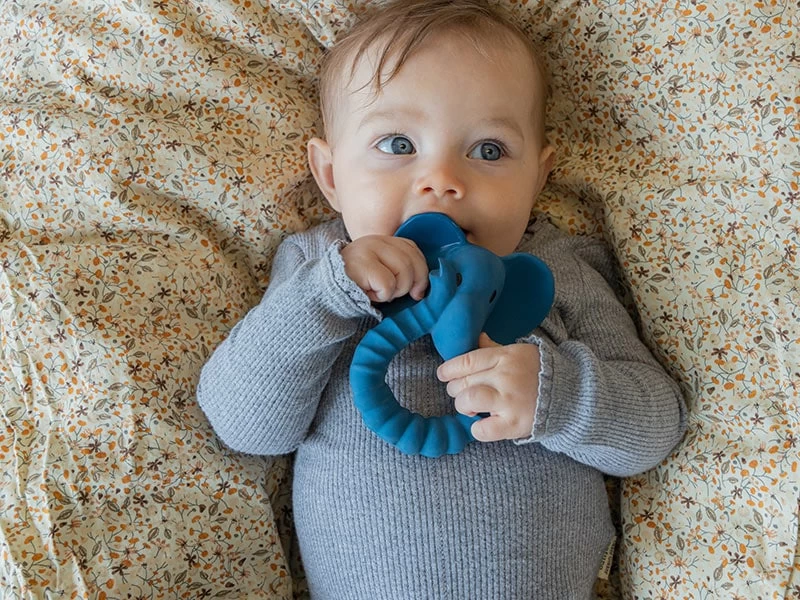 Hochwertiger und weicher Beißring Elefant aus Naturkautschuk in wunderschön kräftigem Tiefblau von der dänischen Marke Natruba. Der Beißring ist mit Naturfarben bemalt, somit lebensmittelecht und unbedenklich für dein Kind. Eine tolle Geschenkidee zur Geburt. Die Kautschukbeißringe von Natruba haben keine Löcher, somit kann kein Schimmel im Inneren auftreten.