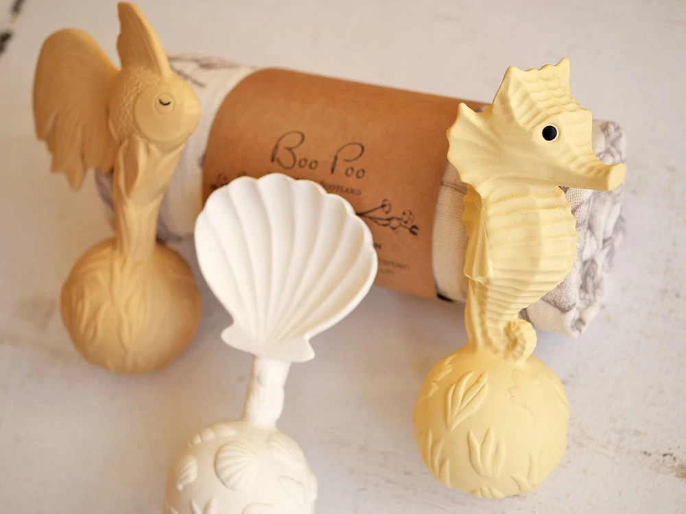 Bezaubernde Rassel und Zahnungshilfe zugleich. Dieses zuckersüße handgearbeitete Seepferdchen aus naturbelassenem Kautschuk in der Farbe „Sand“ ist von der Marke Natruba. Beim Schütteln klingelt ein angenehmer Glöckchenton. Das Seepferd ist lebensmittelecht und unbedenklich für dein Kind. Die Kautschukbeißringe von Natruba haben keine Löcher, somit kann kein Schimmel im Inneren auftreten.