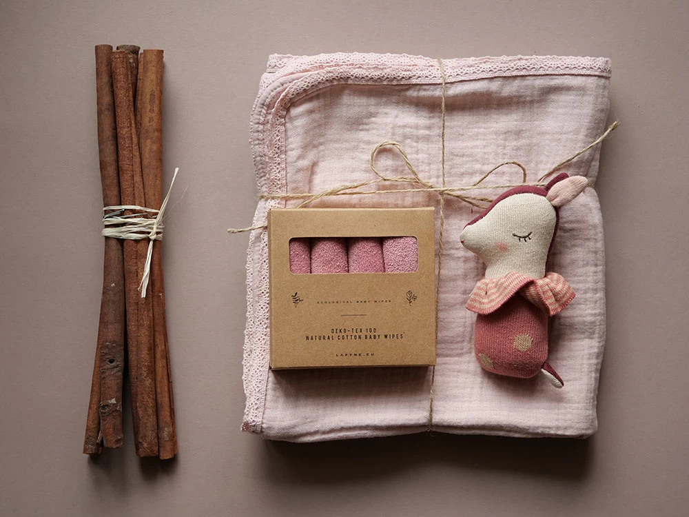 Wunderbares Geburtsgeschenk-Set für Babyparty, Taufe und Co. Mit der süßen Rassel unschlagbar. Es besteht aus: 1x Maileg Babyrassel Bambi Rose + 1x Musselindecke mit Häkelrand 105×110 cm Misty Rose + 1x Pack Waschlappen Berry