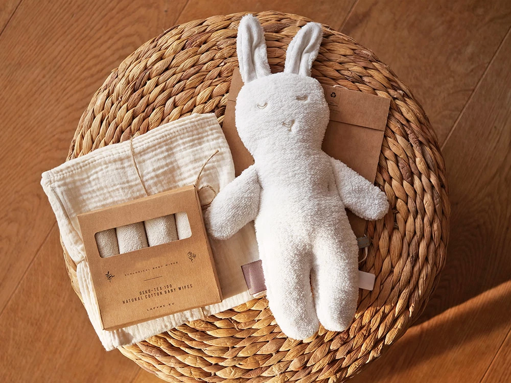 Praktisches und sinvolles Babygeschenk Set zur Geburt für Freunde und Bekannte. Bestehend aus 1x Kuscheltier Ruby Rabbit Stone Beige, 1x Musselintuch 50×50 cm Macadamia und einem 4-er Pack Waschlappen Natural.
