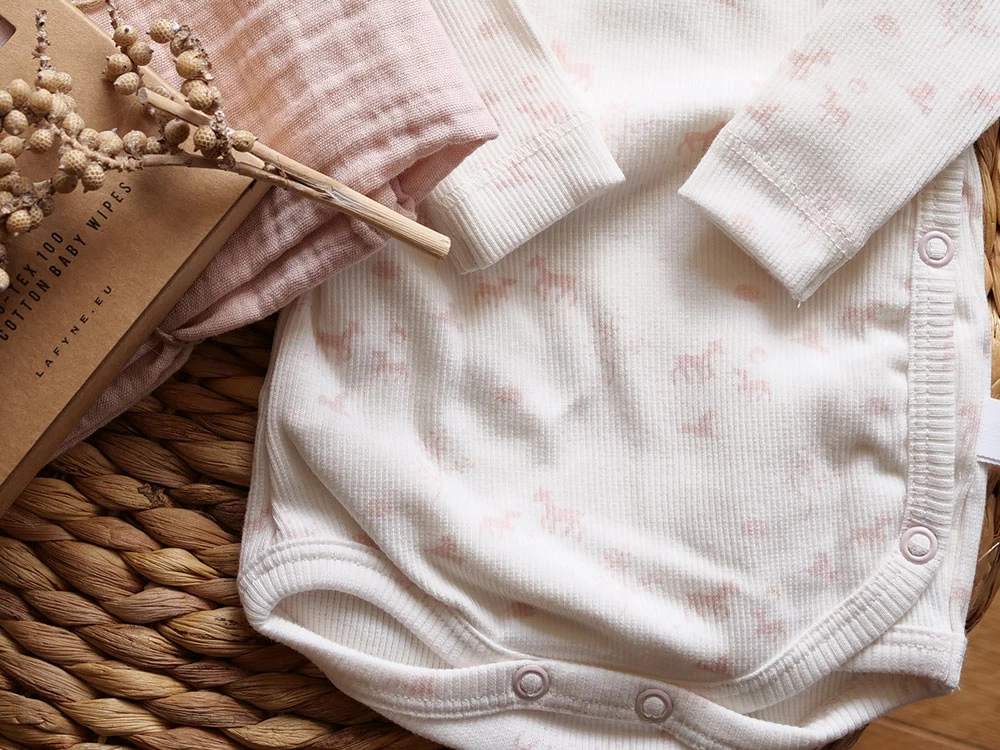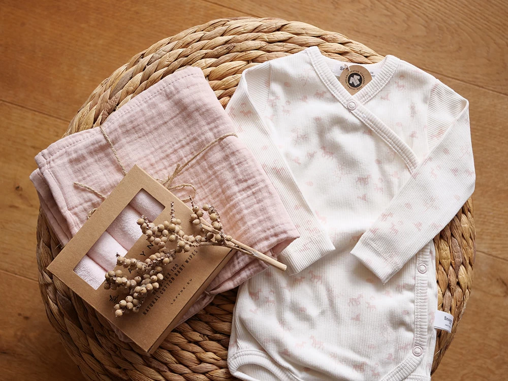 Praktisches und sinvolles Babygeschenk Set zur Geburt für Freunde und Bekannte. Bestehend aus 1x Baby Wickelbody Peach Blush Springtime, 1x Musselintuch 50×50 cm Misty Rose und 1x 4-er Pack Waschlappen Powder.