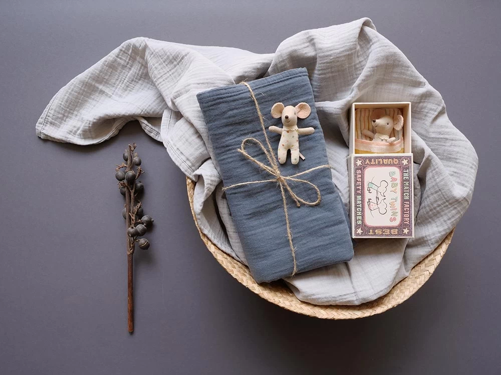 Das Zwillingsgeschenk – Set enthält zwei große Mullwindeln (110×110 cm) in edlen Farbtönen. Dazu gesellen sich zwei zuckersüße Babymäuse (selbstverständlich Zwillinge) in einem Schlafsäckchen und einer robusten Box verpackt.