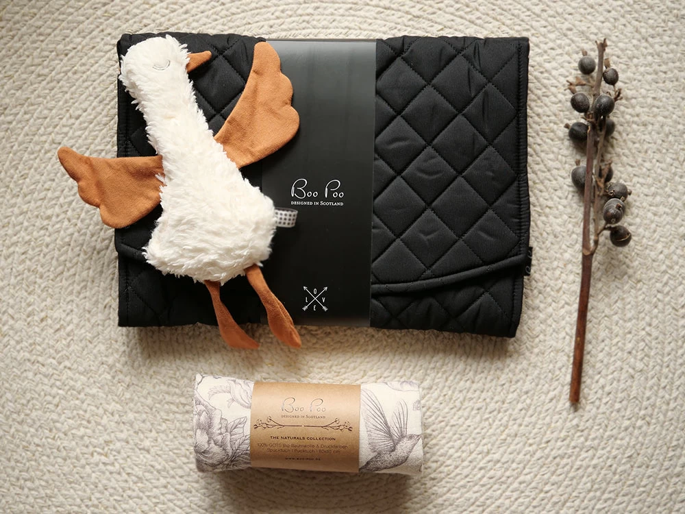 Drei hochwertige und ästhetische Babyartikel haben wir für dich zusammengestellt: die Boo Poo Reise-Wickelunterlage zum Füllen, Falten und am Kinderwagen aufhängen, ein wunderschön bedrucktes Musselintuch aus 100% GOTS Baumwolle und eine super süße Kuschel-Ente Diddy Duck, Baby’s erster Freund. Viele umweltbewusste Eltern benutzen diese feinen Waschlappen als Alternative zu Einmalwaschlappen oder Feuchttüchern im Alltag mit Baby.