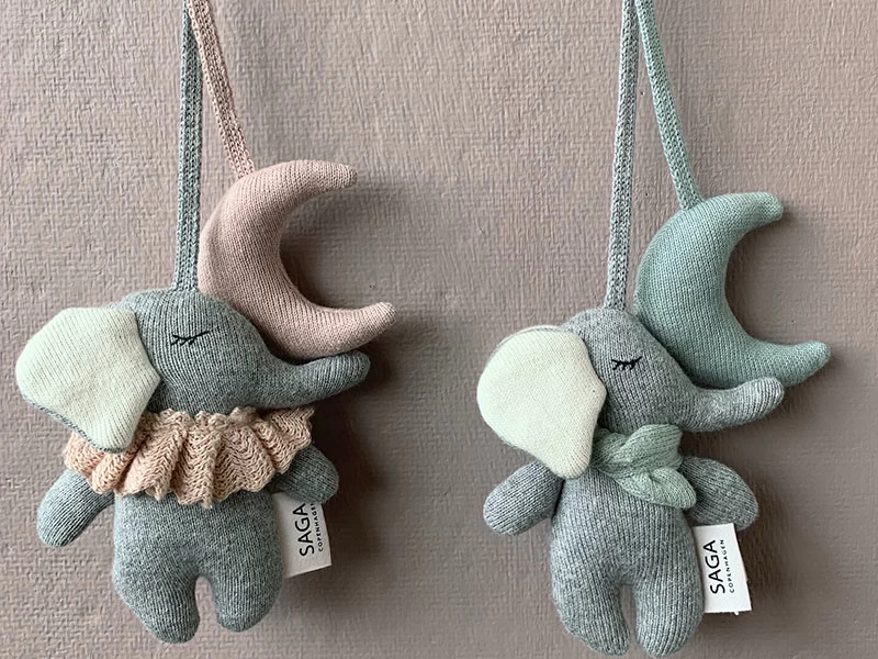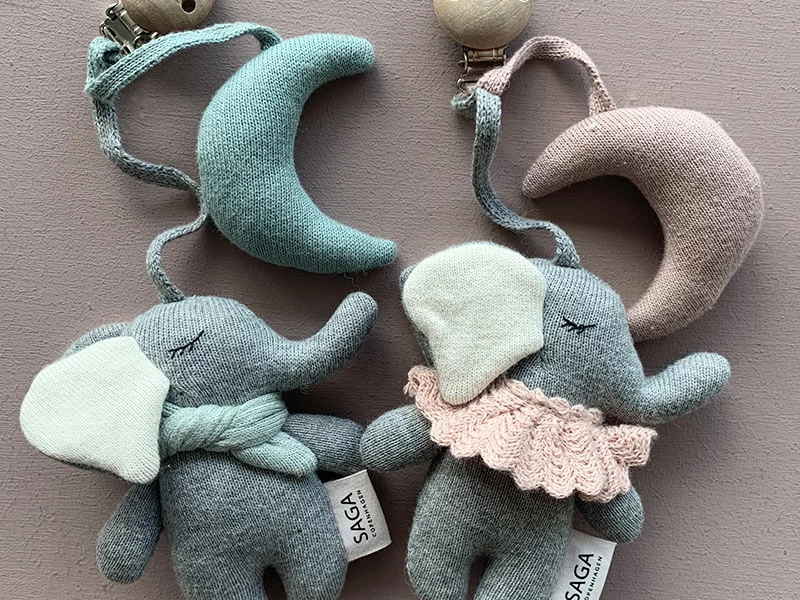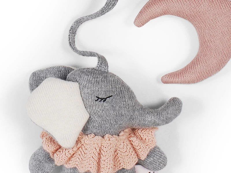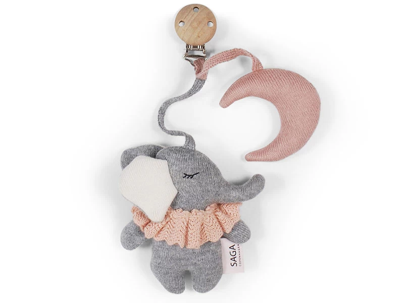 Hochwertig verarbeitete und super süße Kinderwagenkette mit Clip aus Buchenholz und 100% Biobaumwollstrick. Der kleine Elefant hat eine zartrosa Halskrause, der Mond ist in Altrosa.