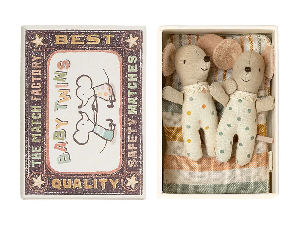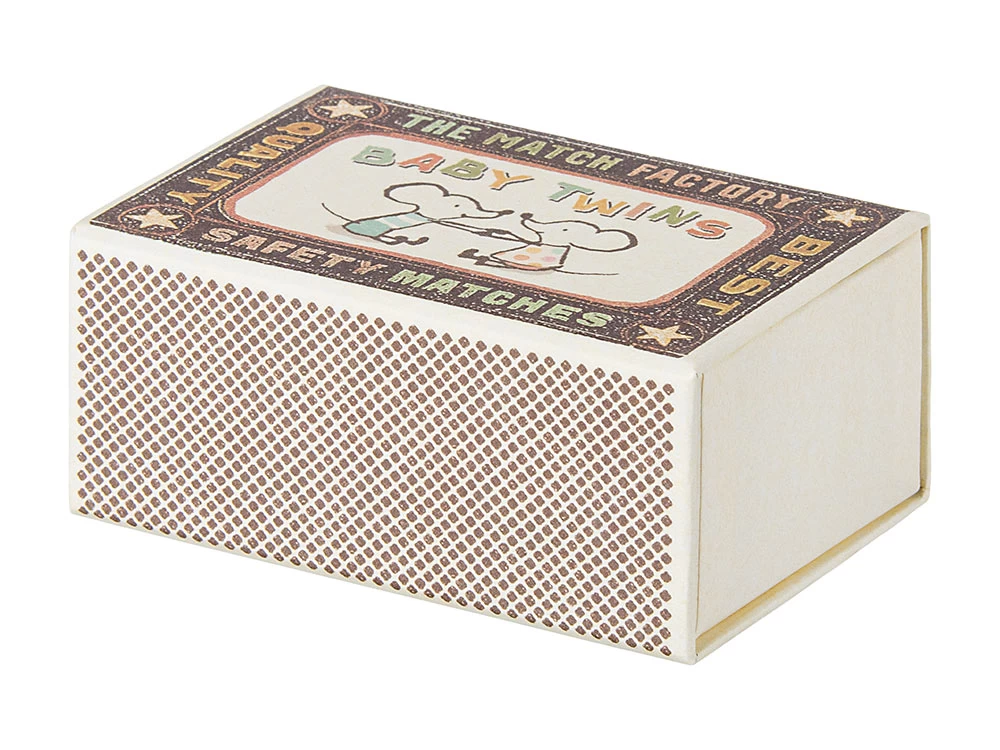 Diese süßen Mäusezwillinge sind ein wunderbares Geburtsgeschenk für werdende Eltern mit Zwillingen oder mit Geschwisterkind. Die hochwertig verarbeiteten Babymäuse der Marke Maileg kommen in einer stabilen Box im Streichholzschachtel-Look und einem kleinen Schlafsack.
