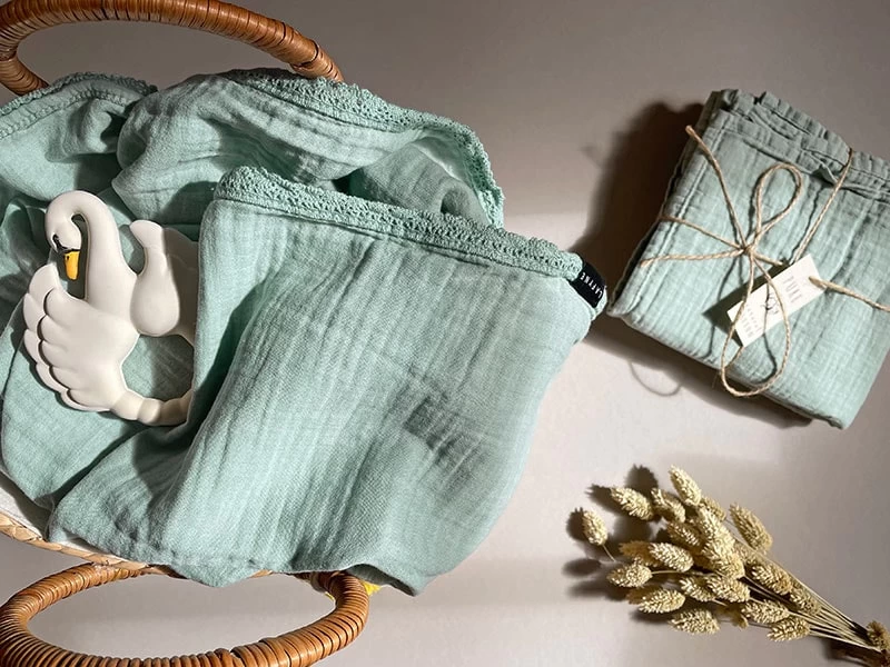Traumhafte Babydecke aus Musselinstoff zum Pucken und Kuscheln in der Farbe Seagrass. Der weiche Baumwoll-Häkelrand ist edel verarbeitet.