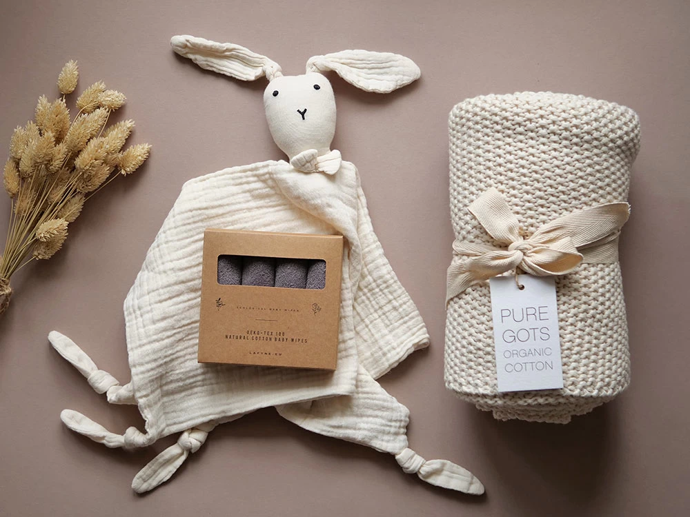 Die Babydecke Eden ist unsere Beliebteste Decke, ultraweich und gob gestrickt. Farblich dazu passend der Schnuffeltuch-Hase aus Musselinstoff (Baumwolle Ökotex 100) mit langen Öhrchen und „Füßchen“ zum Nuckeln und Kuscheln. Ein Viererpack Babywaschlappen für die Babypflege vervollständigt das liebevolle Paket. Viele umweltbewusste Eltern benutzen diese feinen Waschlappen als Alternative zu Einmalwaschlappen oder Feuchttüchern im Alltag mit Baby.