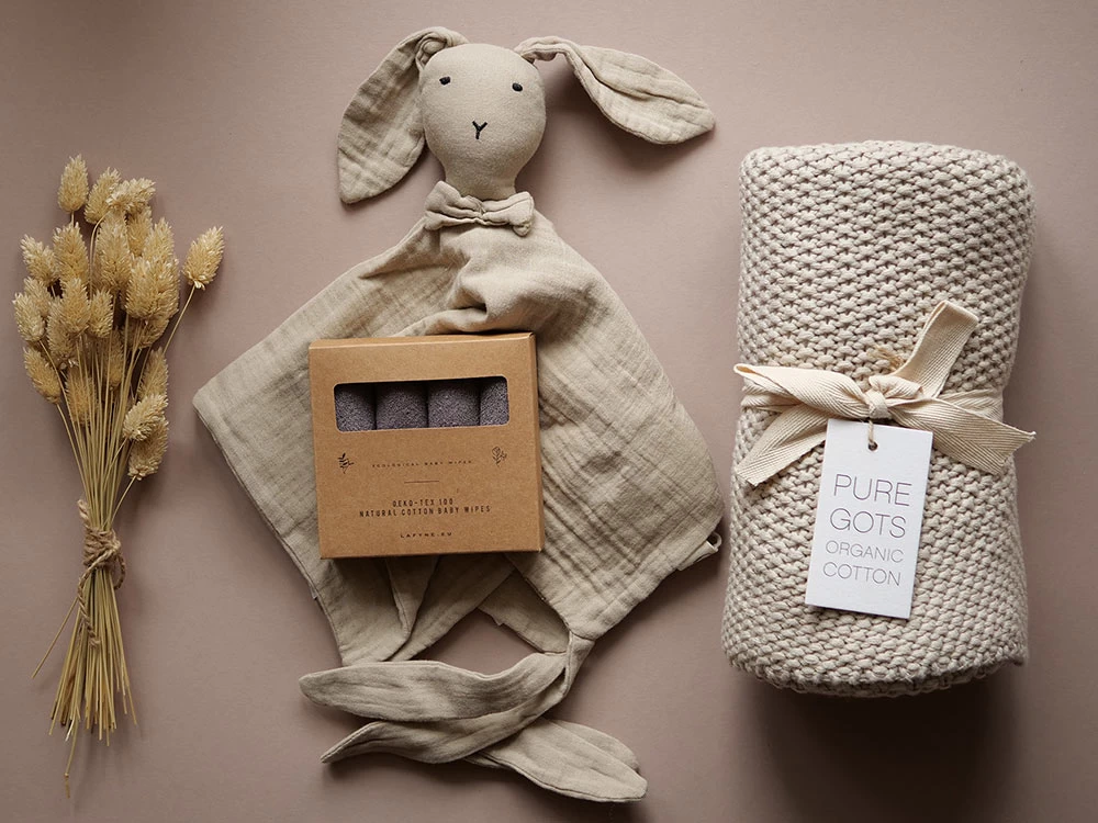 Die Babydecke Eden ist unsere Beliebteste Decke, ultraweich und gob gestrickt. Farblich dazu passend der Schnuffeltuch-Hase aus Musselinstoff (Baumwolle Ökotex 100) mit langen Öhrchen und „Füßchen“ zum Nuckeln und Kuscheln. Ein Viererpack Babywaschlappen für die Babypflege vervollständigt das liebevolle Paket. Viele umweltbewusste Eltern benutzen diese feinen Waschlappen als Alternative zu Einmalwaschlappen oder Feuchttüchern im Alltag mit Baby.