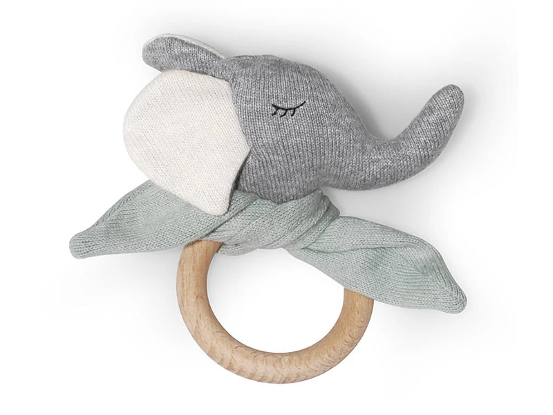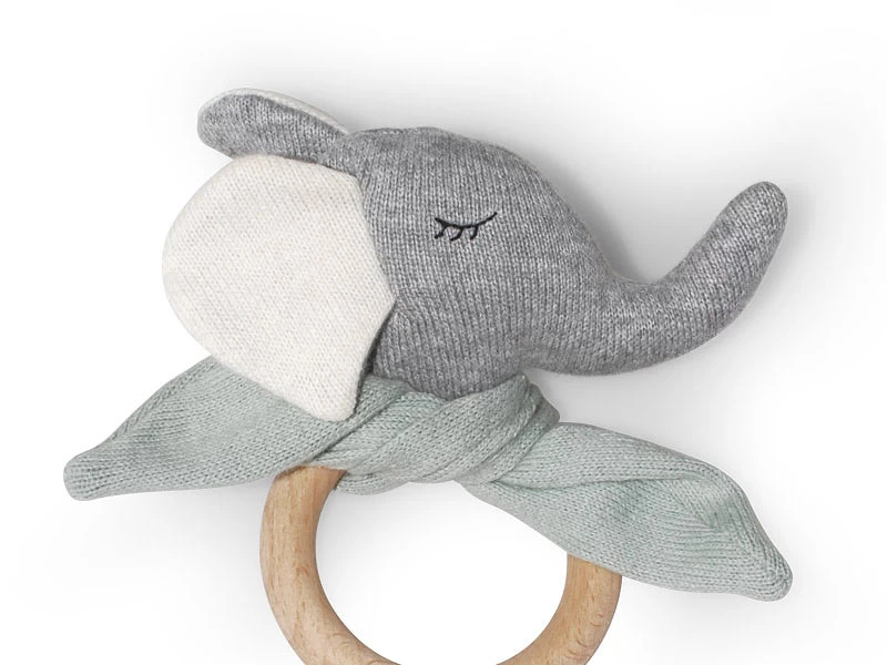 Dieser hochwertige Beißring hat einen kleinen Elefantenkopf mit zartgrünem Schal, ein idealer Kuschelfreund mit Zahnungshilfe. Der Elefant ist aus 100% Biobaumwolle, der Holzring ist aus unbehandelter Buche.