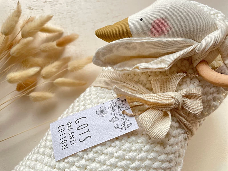 Schönes und hochwertiges Babyspielzeug mit Holzbeißring, einem hübschen Gänsekopf und raschelnden Flügeln. Die Gans ist aus 100% Biobaumwolle, der Holzring ist aus unbehandelter Buche.