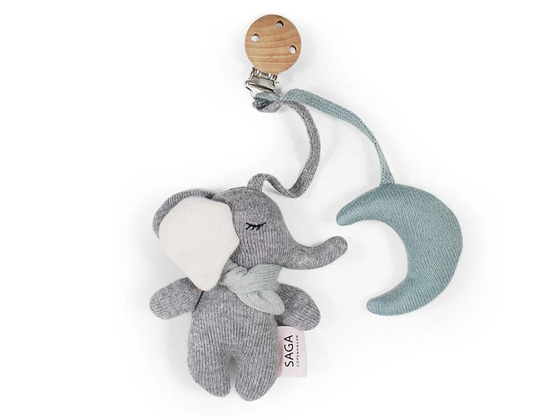 Hochwertig verarbeitete und super süße Kinderwagenkette mit Clip aus Buchenholz und 100% Biobaumwollstrick. Schal und Mond sind in einem grünblauen Farbton.