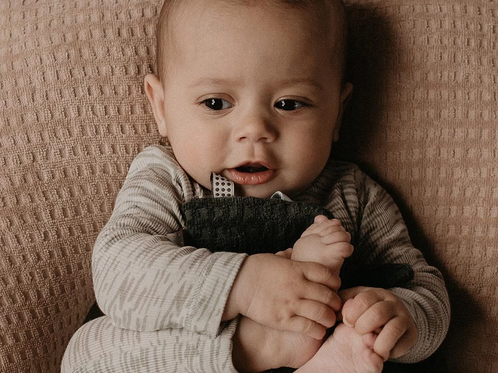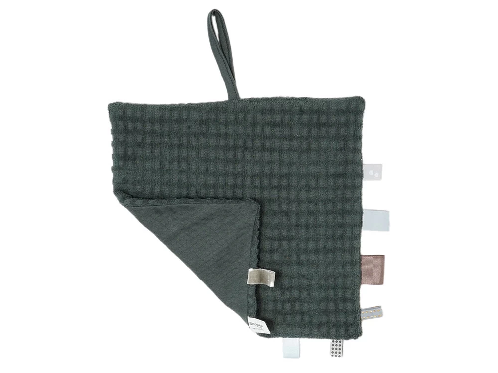 Flauschiges Schnuffeltuch mit vielen Labels aus Biobaumwolle, ideal von Geburt an bis ins Kindesalter. Farbe des Kuscheltuchs: Dark Green.