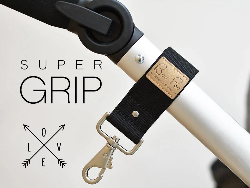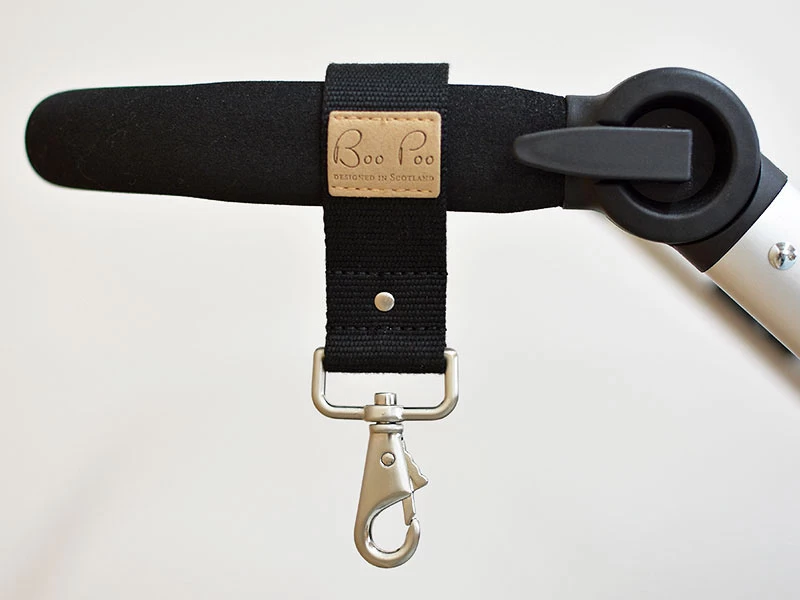 Die Boo Poo Kinderwagenaufhängung ist „smart“, denn die Gurtbänder rutschen, dank ihrer Gumminobben am Inneren, nicht an der Lenkstange ab!