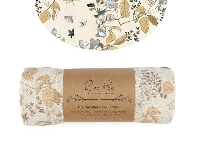 Naturbelassenes Spucktuch / Pucktuch aus Musselinstoff in der Größe 80×80 cm für dein Baby von Geburt an. Der GOTS zertifizierte Aufdruck besteht aus einem edlen Waldleben Design  in zarten Farbtönen.