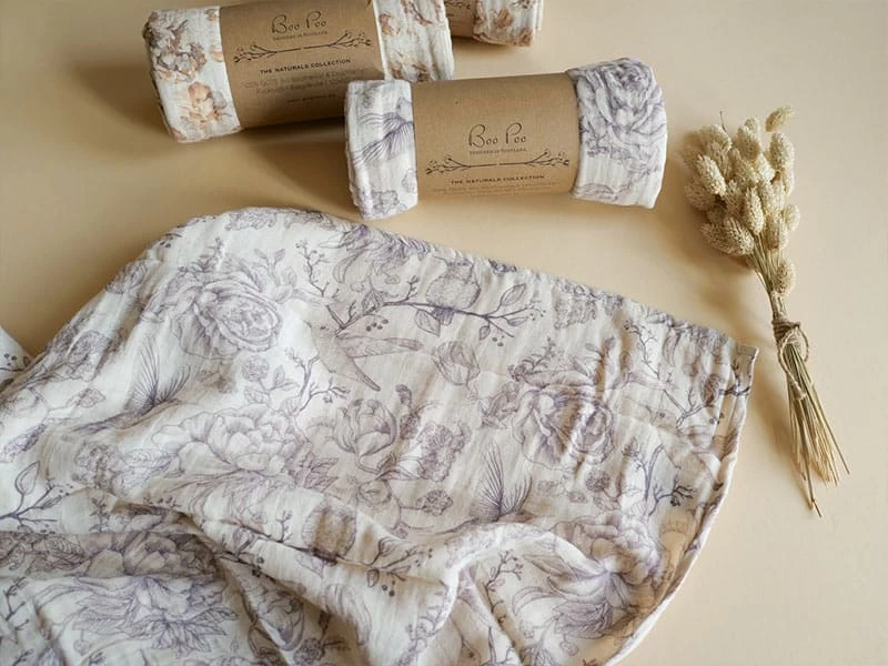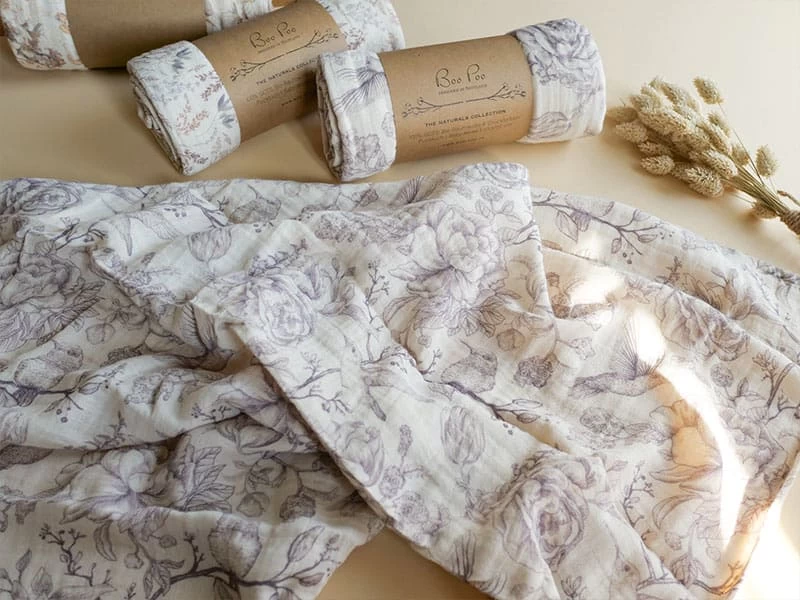 Naturbelassenes Spucktuch / Pucktuch aus Musselinstoff in der Größe 80×80 cm für dein Baby von Geburt an. Der GOTS zertifizierte Aufdruck besteht aus einem edlen Blüten & Kolibri Design.