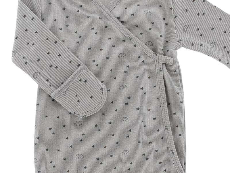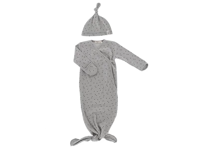 Weicher und leichter Babyschlafsack mit Babymütze aus elastischer Biobaumwolle mit einem süßen Regenbogenmuster bedruckt. Einfach unwiderstehlich getragen in Kombination mit dem Mützchen. Ideal für Neugeborene zum Schlafen in Innenräumen. Farbe: Light Grey Rainbow.
