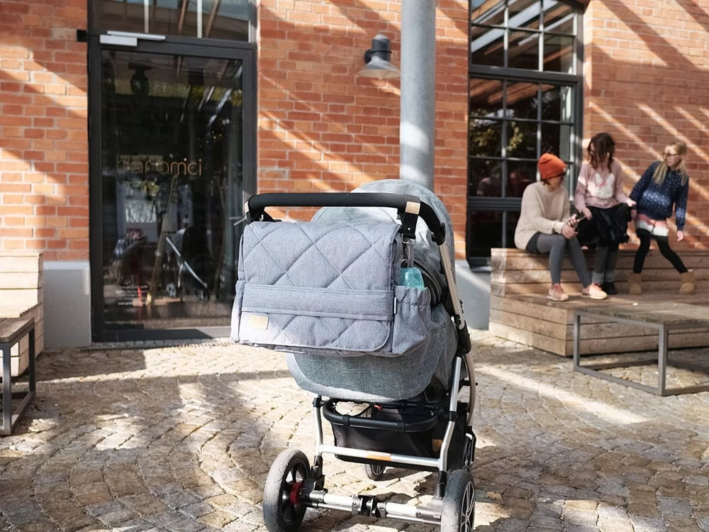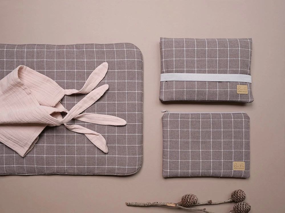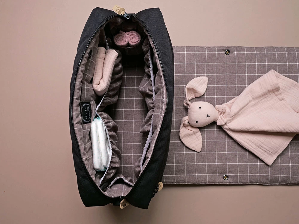 Traumhafte Wickeltasche in schwarz und braun. Der schöne Tartan Baumwollstoff auf der Wickelunterlage und im Futter hat ein edles Karo-Design, ideal für Eltern mit Neigung zu hochwertiger Eleganz.