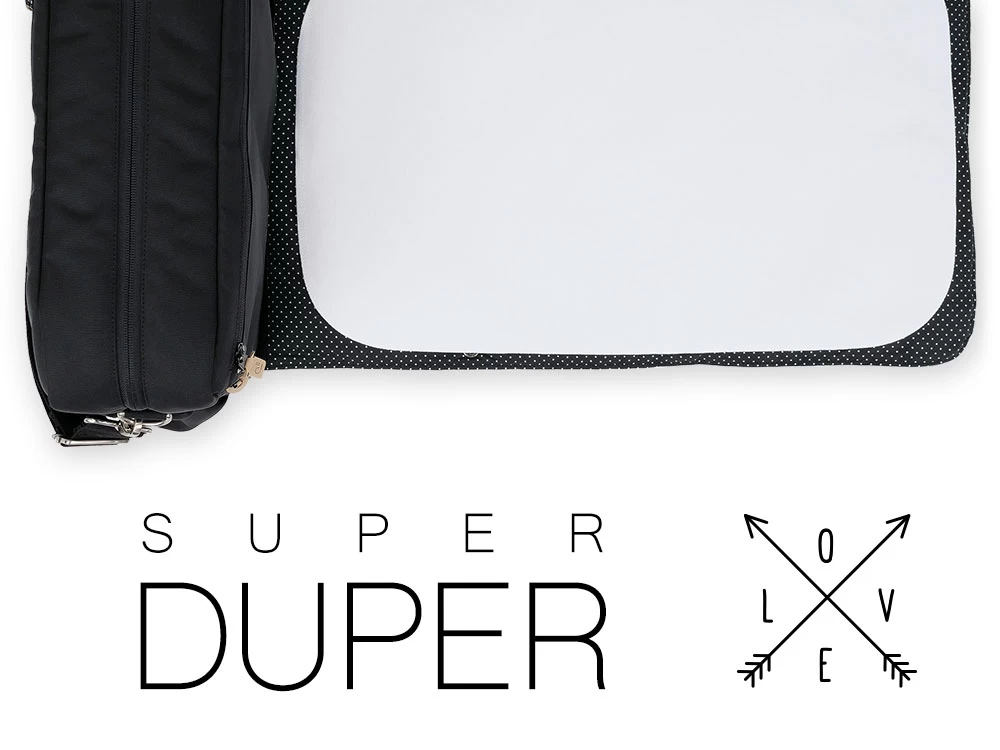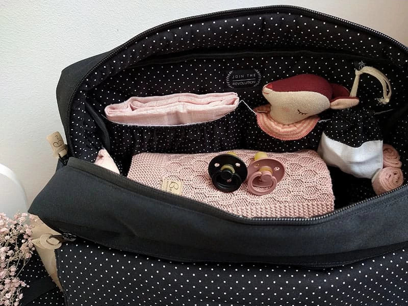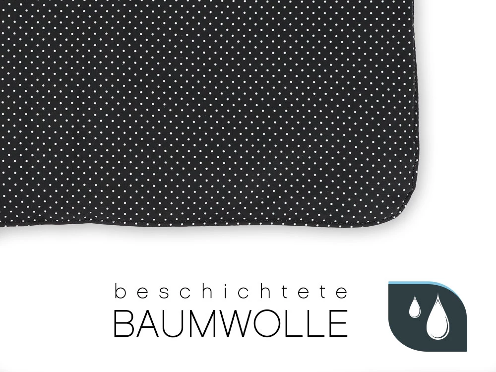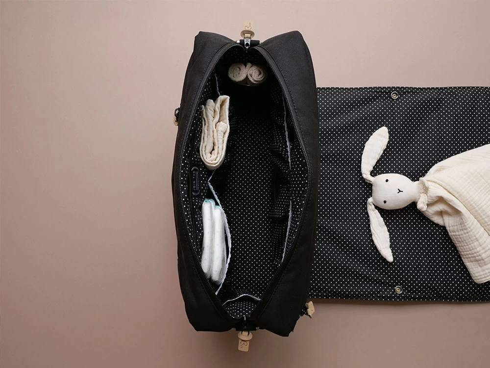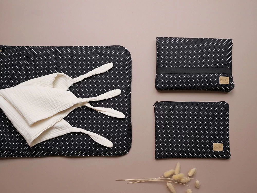 Schwarze Wickeltasche mit wasserfestem Innenstoff und minimalistischem Design. Diese ganz besondere Wickeltasche besticht durch ihre schlichte Schönheit und edle Eleganz. Die beschichtete Baumwolle innen ist mit kleinen weißen Tüpfchen übersät.