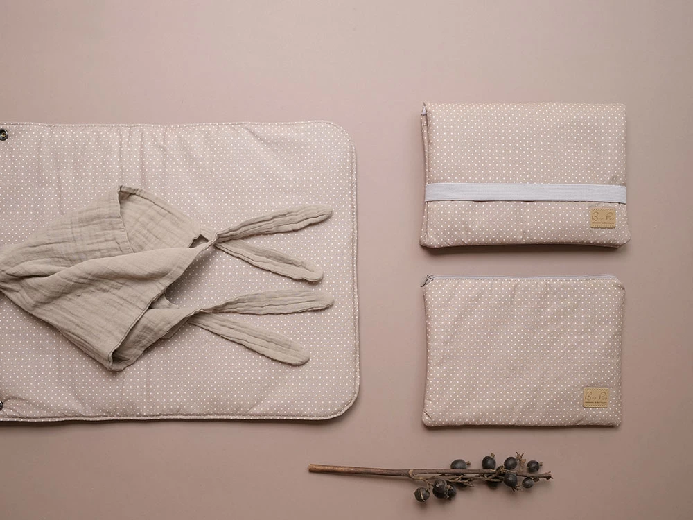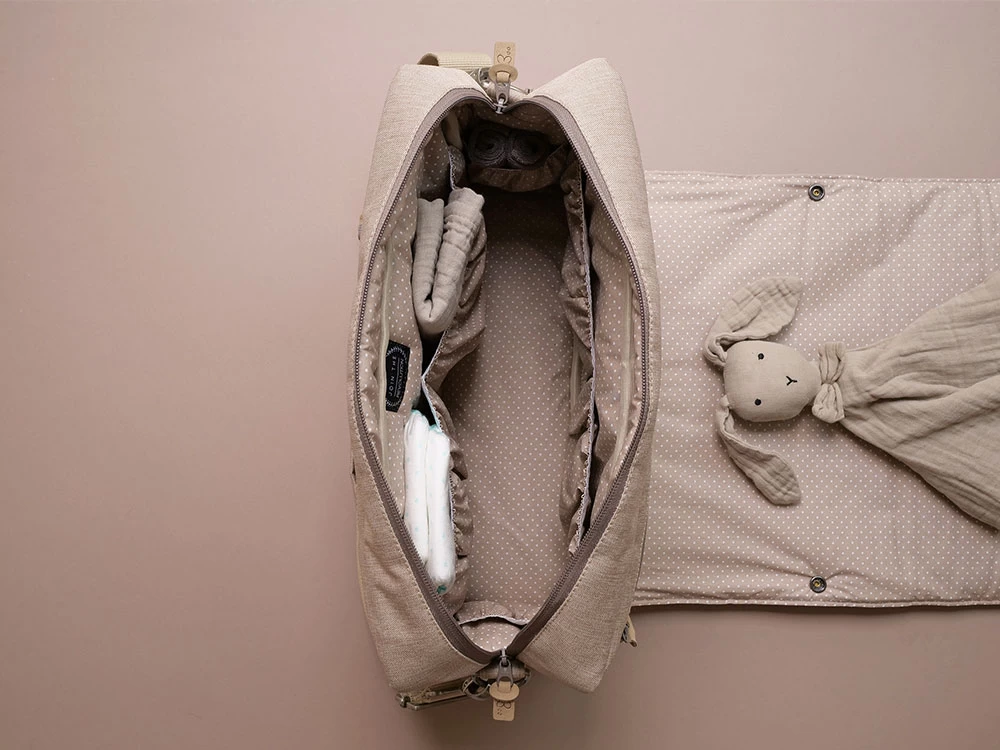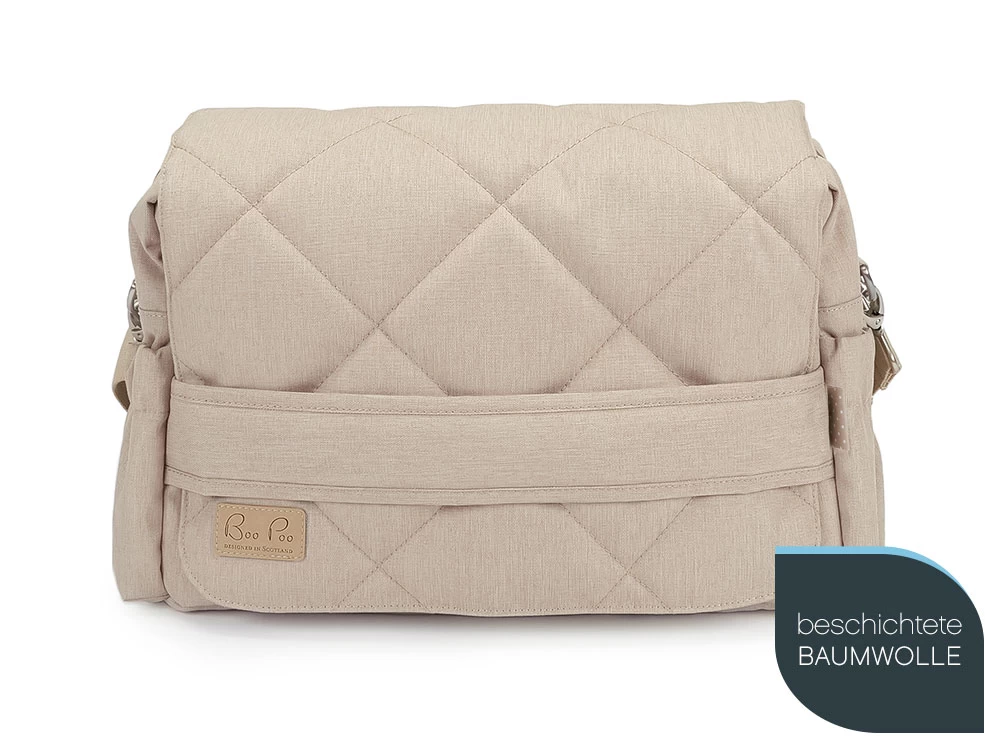 Wunderschöne beige Wickeltasche mit wasserfestem, robusten Außenstoff und beschichteter Baumwolle im Innenfutter und auf der Wickelunterlage. Die traumhafte Farbkombination überzeugt besonders Eltern, feine Beigetöne suchen.
