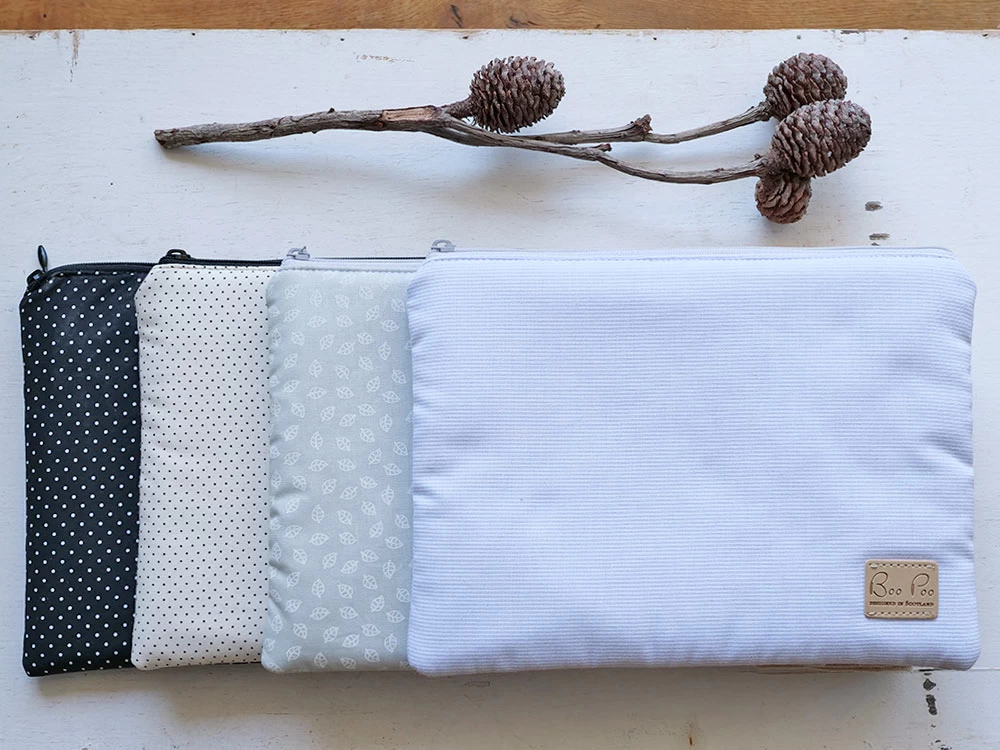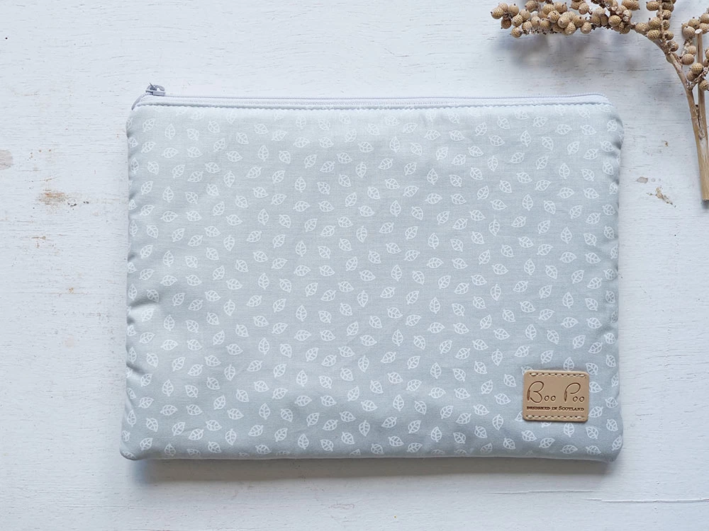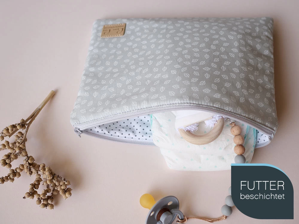 Windeltaschen – Kulturbeutel für Mama und Baby beim Wickeln unterwegs. Der wasserfeste Innenstoff ist leicht abwaschbar. Außen ist die Windeltasche hellgrau mit kleinen weißen Buchenblättchen bedruckt.