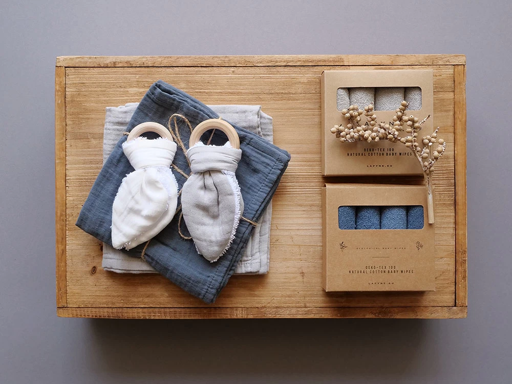 Dieses Geschenk für Zwillinge enthält zwei schöne Beißringe aus Holz mit Baumwoll-Hasenohren, zwei praktische weiche Spucktücher in der Größe 50x50cm und zwei Packungen unserer beliebten feinen Babywaschlappen für Neugeborene. Viele Eltern verwenden diese Läppchen als ökologische Feuchttücher beim Wickeln.